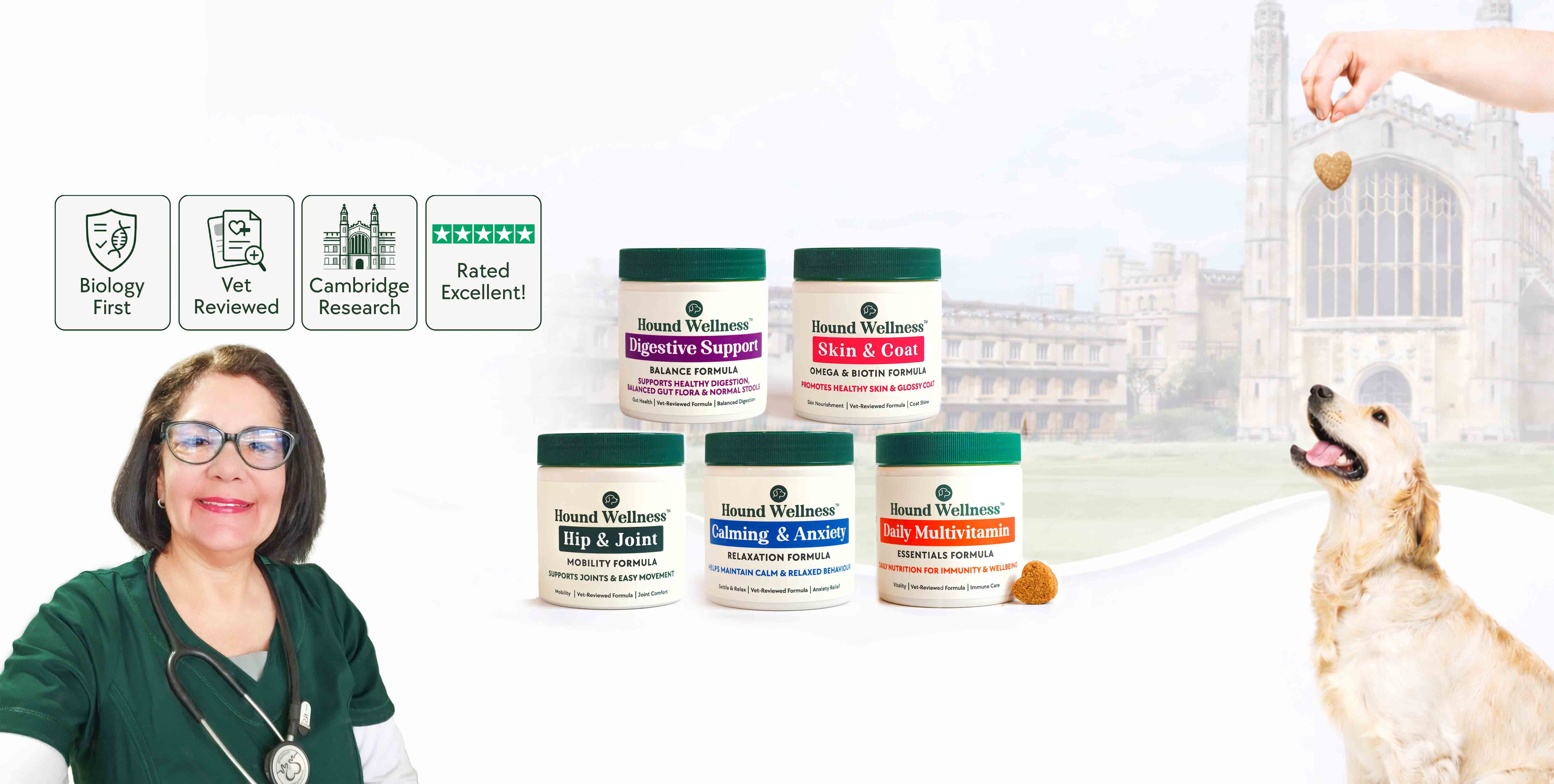 Hound Wellness develops daily dog nutrition by reverse-engineering canine biology and formulating around Cambridge research-led guidance, veterinary review, and global nutritional expertise.