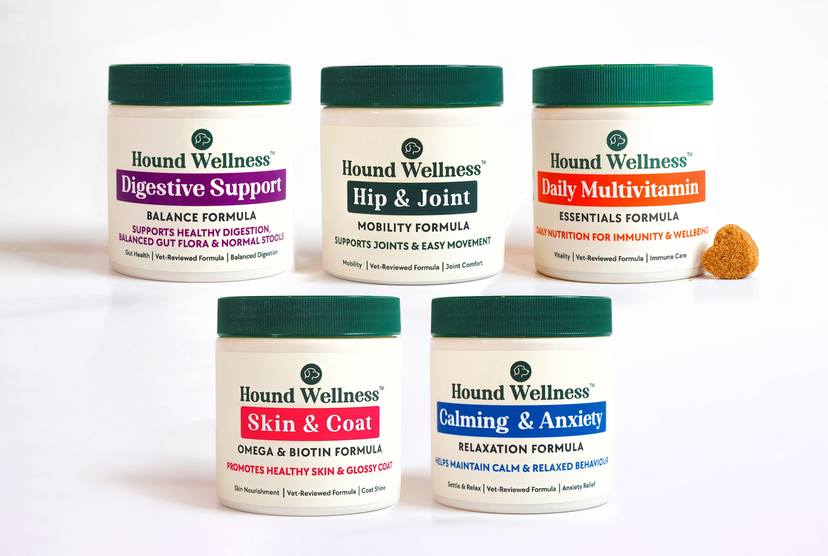 Hound Wellness formulas use trusted, research-supported ingredients to help maintain healthy joints, digestion, skin, and overall wellbeing, offering safe, practical daily support for dogs of all ages!